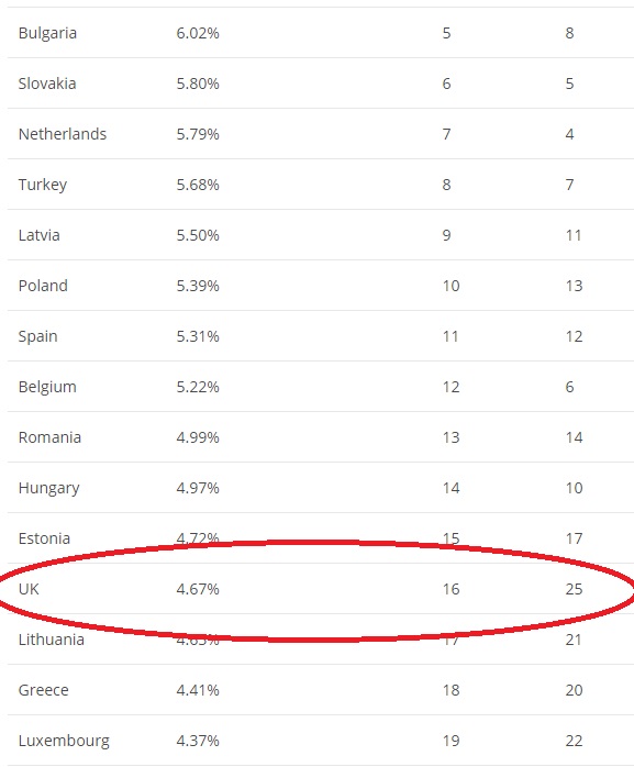 先看看国家的排名,英国的平均收租回报率整体上提了0.67%,达到了4.67%,排名比去年高了9位。(可前面那些国家……真的敢买么)