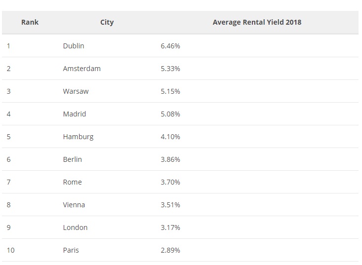 再来看看城市的排名,欧洲10大城市,伦敦的平均租金回报率也比去年高了一些,但不会那么靠前。