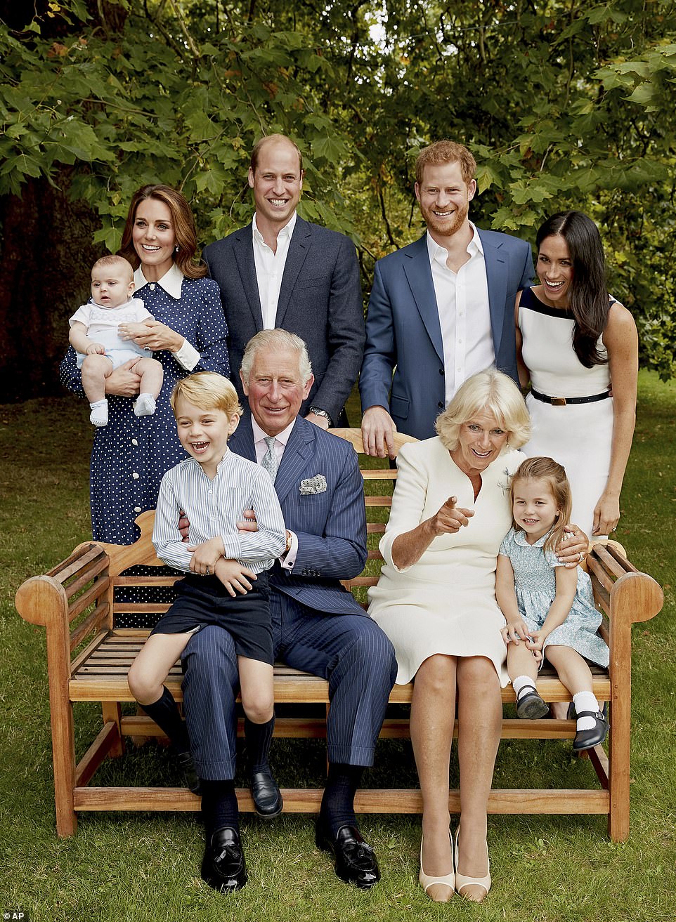 在这张照片里,有查尔斯王子,卡米拉,大儿子威廉王子和凯特王妃,二儿子哈里王子和梅根王妃,还有威廉王子的3个孩子。