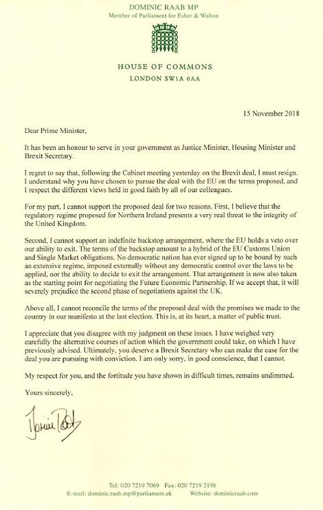 早在英国时间11月15日上午9点之前,Dominic Raab就递交了辞呈。