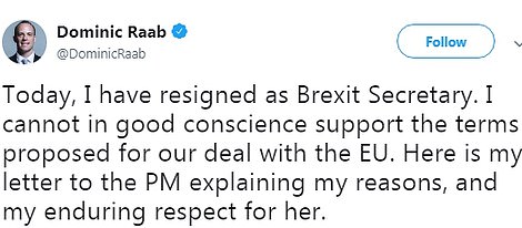 “今天,我辞去了脱欧大臣一职。请恕我难以支持这份脱欧协议,这是我的辞职信,对此我深表遗憾。”