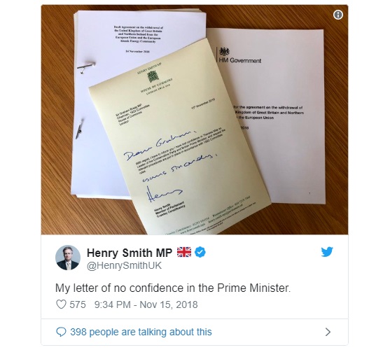 现任欧洲研究会主席,也是推进英国脱欧的主要人员Jacob Rees-Mogg,向保守党1922委员会的主席Graham Brady爵士递交了一份“不信任投票”申请,试图发起对特蕾莎梅的党内不信任投票。