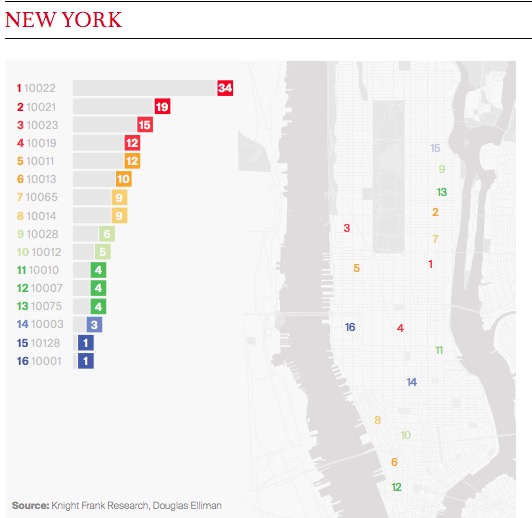 这些豪宅中有33%位于纽约市中心,22%位于含纽约第五大道在内的纽约上东城(The Upper East Side)。主要的房产类型是公寓。