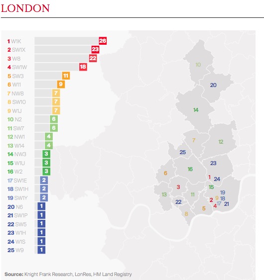 再具体一点,伦敦售出的超级豪宅所在的邮编如下: