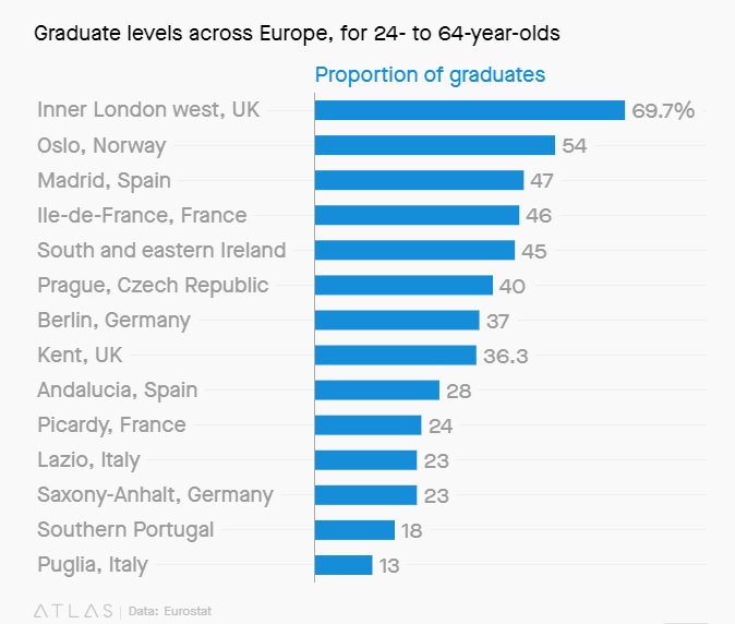 据统计数据调查2016年英国230万高校学员,其中伦敦占据了16%,并且比例在逐年增加。同时多家媒体不止一次引用了伦敦是全欧洲教育程度最高的城市,比第二名挪威的比例高出了15%。