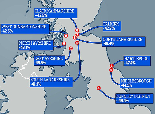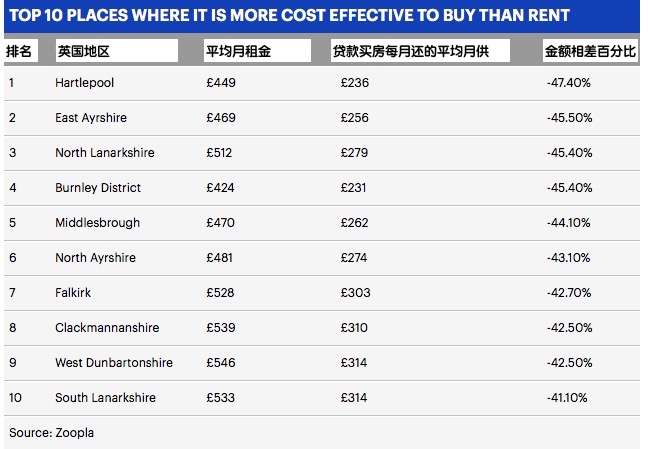 第一名是位于Durham郡的Hartlepool。在这里,平均月租金为449英镑,而平均月供为236英镑,也就是说,买房比租房还便宜47.4%!
