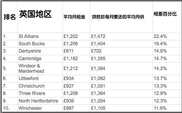 第一名是伦敦的北部通勤区Hertfordshire郡的 St Albans。在这里平均月租金为1202英镑,而月供要还1472英镑。