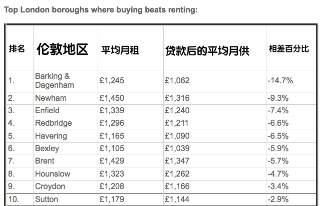 排名第一的是东伦敦Barking & Dagenham区。在这里,租房每月需要1,245英镑的租金,而买房却只需要还约1,062的月供,也就是说,买房比租房还便宜14.7%!