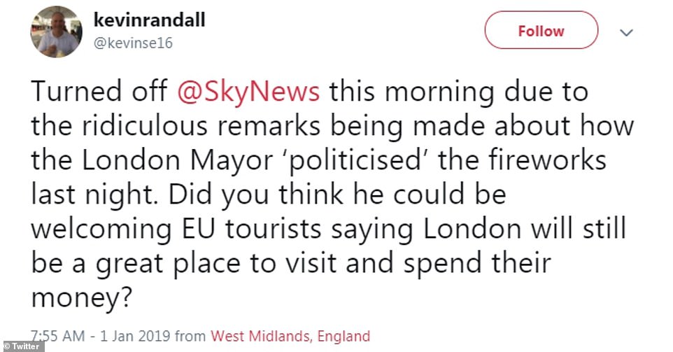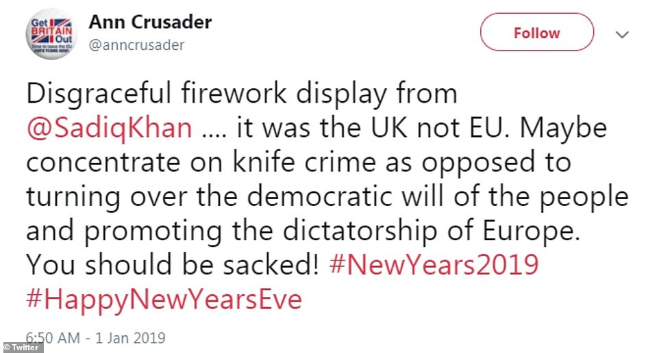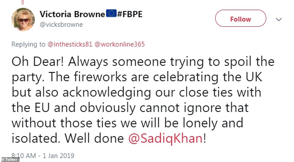 “烟火秀无非就是想表现出我们与欧盟的紧密联系。很明显,如果没有欧盟,我们将被孤立,变得孤独。做得好!Sadiq Khan!”