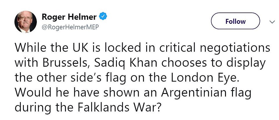 “英国目前正深陷在与布鲁塞尔的谈判中不能脱身,Sadiq却在这个时候把伦敦眼变成了欧盟的旗帜。这不就是在福克兰群岛战争期间悬挂阿根廷国旗的意思吗?”