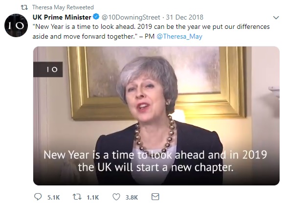 “New Year is a time to look ahead. 2019 can be the year we put our differences aside and move forward together. In 2019 the UK will start a new chapter. The Brexit deal I have negotiated delivers on the vote of the British people. If Parliament backs a deal, Britain can turn a corner. The referendum in 2016 was divisive. But we all want the best for our country and 2019 can be the year we put our differences aside and move forward together, into a strong new relationship with our European neighbours and out into the world as a globally trading nation.”