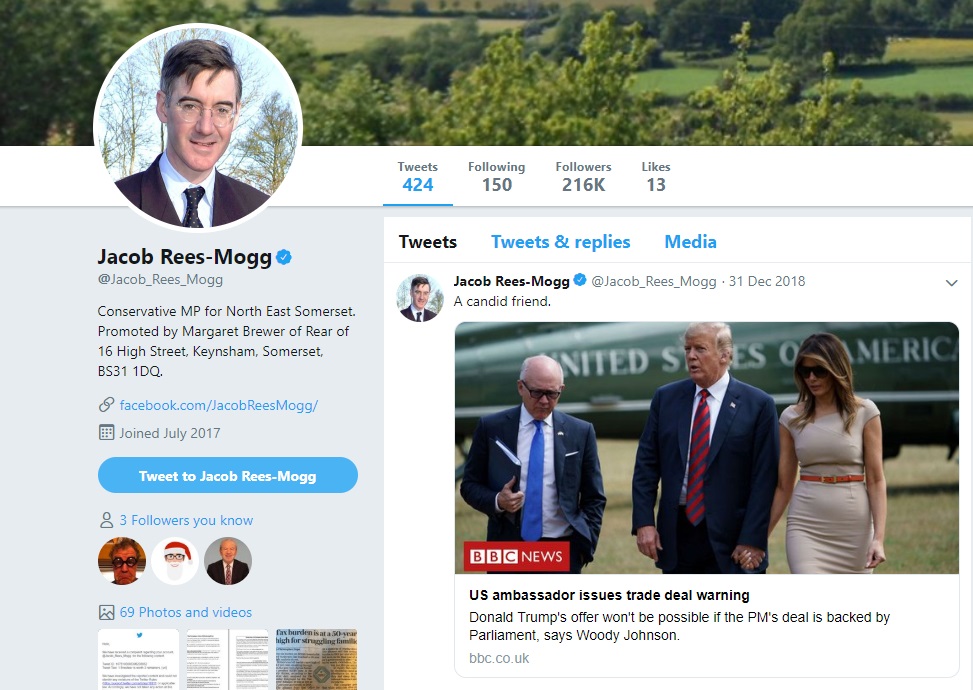 之前作为强硬派领袖,发动“宫变”不信任投票的鲍里斯,失败之后一直销声匿迹没说啥话,快过年的时候转载了一条美国大使的发言,还是在指责特蕾莎梅的协议“不给力”,侧面施压。