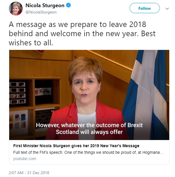 先前twitter喊话支持科尔宾的苏格兰SNP党魁Nicola Sturgeon就很看得清形势。她知道在工党表明立场之后留欧无望,在新年讲话中压根就没提留欧和第二次公投的事情,转而开始宣传起苏格兰: