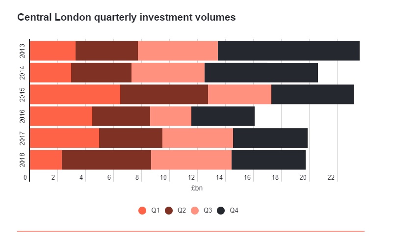 2018年,伦敦商业地产的投资金额为197亿英镑。虽然对比2017年有1%左右的回调,但是对比2016年的161亿英镑还是有22%的增幅。