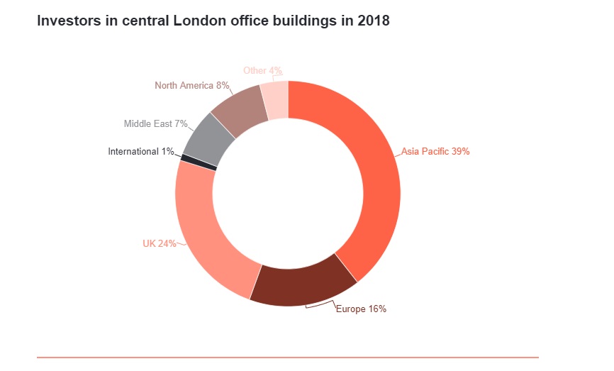 英国本国投资人的比例,高于2017年的18%,连续三年增长。亚太地区和欧洲地区则依然是伦敦商业地产投资的主力,资金流入比例超过了50%。