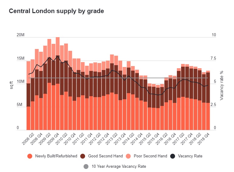 下图为2008年-2018年伦敦商业用地供给的分级柱状图,粉柱收缩,红柱和深红柱子强势代表供给倾向于优质的新办公楼。