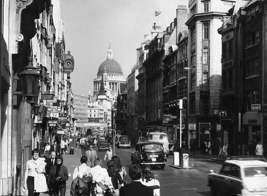 20世纪70年代,对着圣保罗大教堂的这条 Fleet Street街道上,是这样的