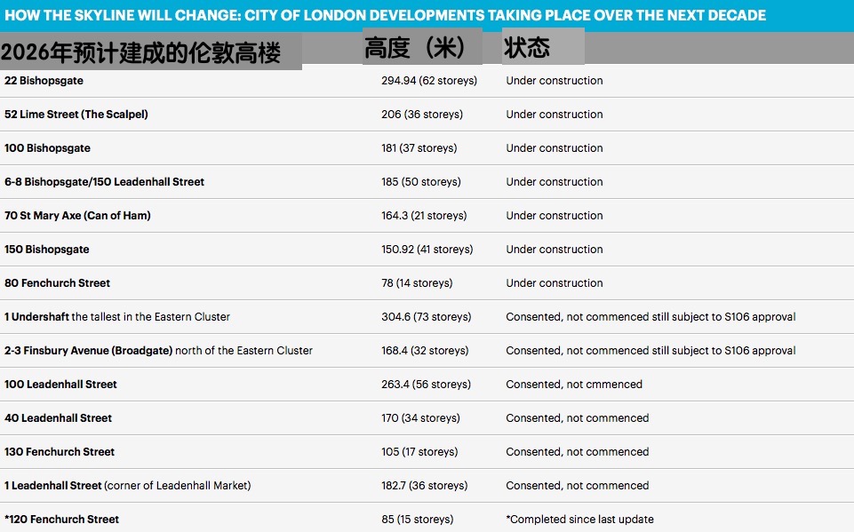2026年,伦敦金融城新出现的地标建筑,高度和状态如下