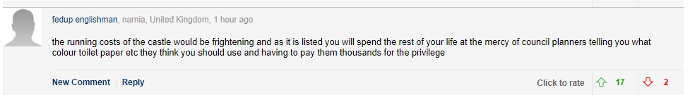 “如果你选了古堡,那你的余生都将被沉重的运行维护成本所困扰。对于保护建筑,当地政府甚至会告诉你该使用什么颜色的厕纸以便于保护你的房产。”