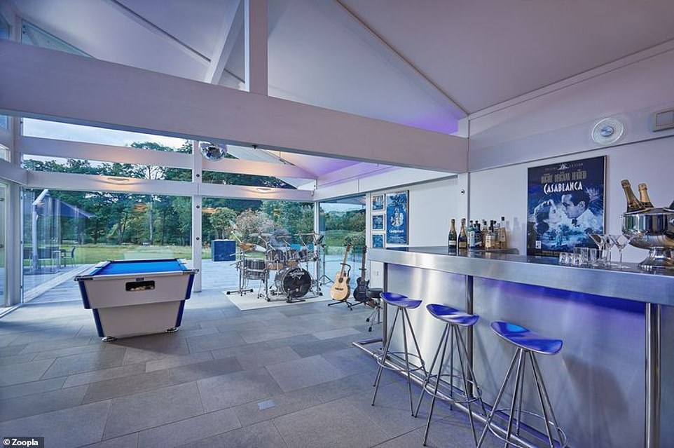 娱乐室还有台球桌和架子鼓,吧台