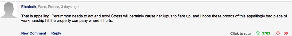 “简直可怕!Persimmon公司必须要立刻采取行动。如此压力和粉尘肯定会让女主人的狼疮发作,希望这些令人震惊的照片能戳中这家地产公司的痛处!”