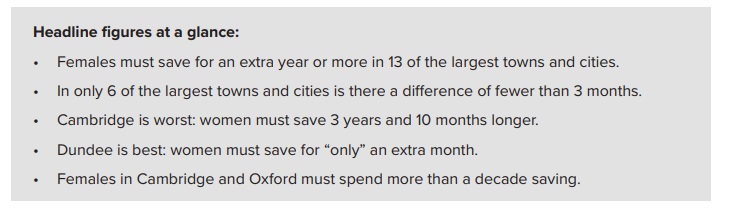 2、部分极端情况的城市中,女性需要比同龄男性多攒超过3年时间来支付房款首付(剑桥,牛津);