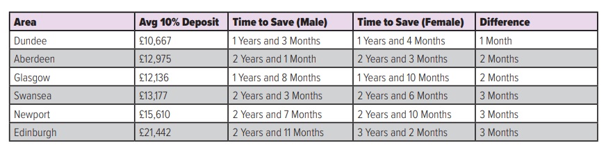英国的房产市场中,女性和男性攒首付时间最相近的6个城市中,没有一个是在英格兰。其中苏格兰占了4个,威尔士占了两个。