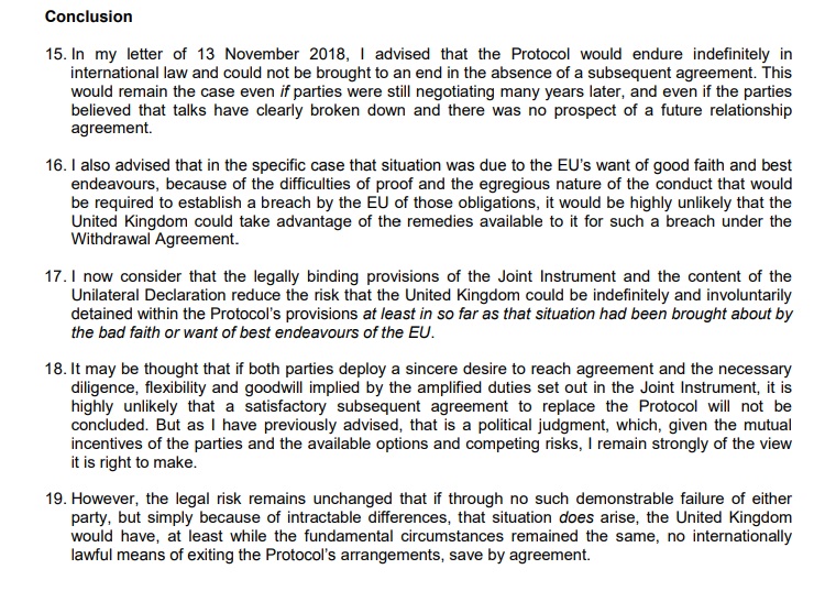 我在2018年11月13日那天,对当时的Backstop协议作出了一份法律意见文书。英国可能会在没有达成有效协议或者谈判破裂等因素而被永久困在Backstop协议里。如果欧盟欠缺真诚,或者欧盟压根就没想尽最大的努力好好谈,那么根据当时的协议英国是没有什么补救措施的。只能被欧盟这么拖着。