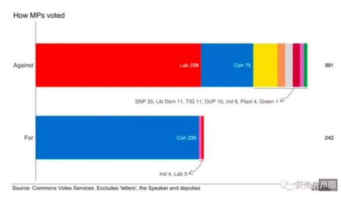 其中,反对特蕾莎梅协议的议员减少了。 有不少人从反对一方转移到了支持的一方。 甚至有3名工党议员支持了特蕾莎梅的协议。 但是,这一切还远远不够。投票依旧以149票之差落败。