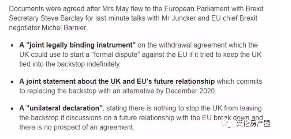 3月11日欧盟针对当前协议所做的让步,在具体条款上并没有什么变化,而是附加上了额外的三份英国和欧盟双方都达成共识的文件。这三份文件包括: