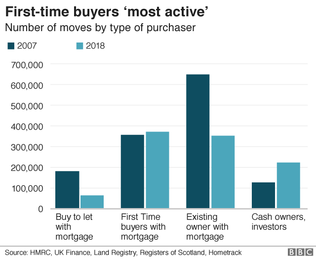 如下图所示:2007年(深色)和2018年(浅色),买房出租投资者,贷款的首次购房者,已经拥有住房还在偿还贷款者,现金购房者的数量如下