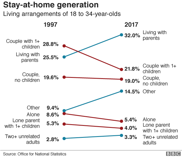 1997年的时候,18-34岁的英国日人最可能的是有自己的家,还有一到两个孩子。而如今,他们中的许多人却和父母住在一起。