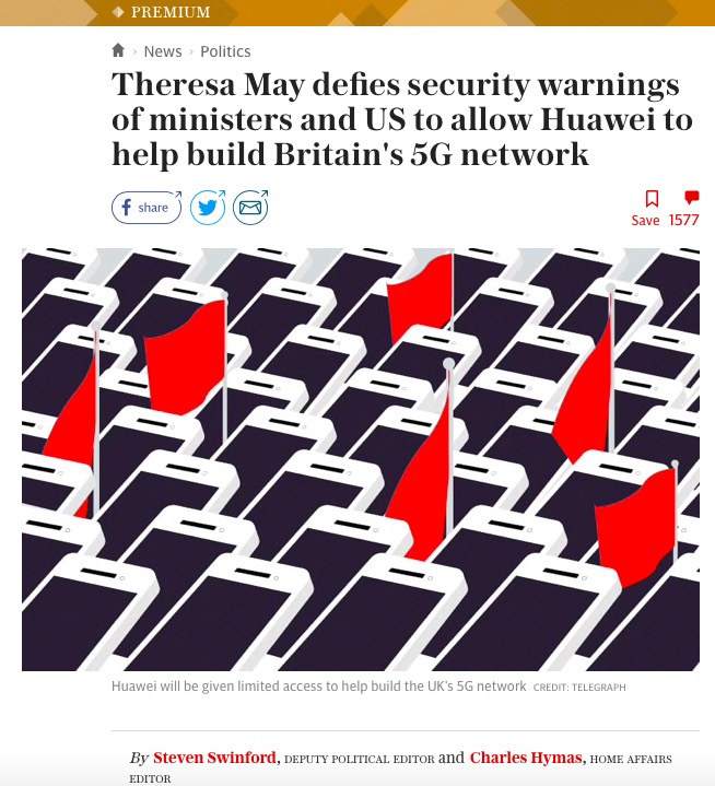 一周多以前的4月23日,由英国首相特蕾莎·梅担任主席的英国国家安全委员会(National Security Council)在会议上同意华为“有限制”地参与诸如天线以及其它“非核心”基础设施之类的5G网络建设。这个属于国家机密的内容在第二天就被《每日电讯报》曝光