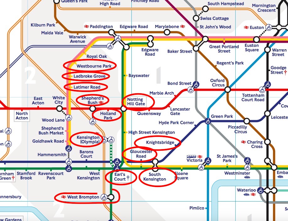 交通方面,肯辛顿位于伦敦最繁忙的市中心地区,自然交通线路密集,主要站点如下图所示: