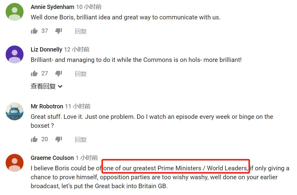 在YouTube的录播视频评论区,英国民众也是一片赞扬,称鲍里斯有效地建立了民众与首相之间的沟通渠道。