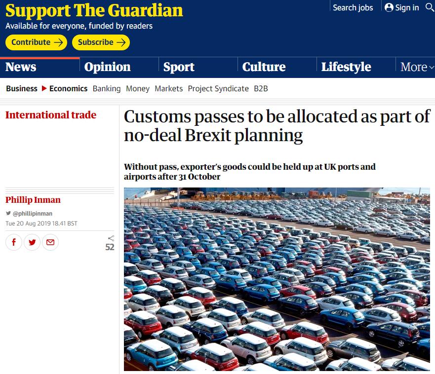 英国政府将在未来两周内向数千家企业分配海关通行证,以防止货物在英国脱欧谈判无果的情况下滞留在英国边境。如果没有通行证,出口商的货物将可能在10月31日之后滞留在英国港口和机场。到目前为止,向欧盟出口的25万家企业中约有7.2万家报名申请了海关通行证。