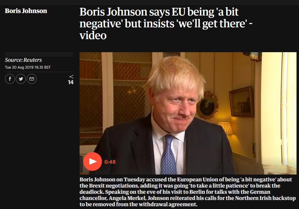 在与德国总理默克尔和法国总统马克龙举行会谈之前,鲍里斯发表讲话,重申了他的呼吁,即从脱欧协议中取消对爱尔兰边境兜底计划的支持,并丝毫不拖泥带水地将脱欧谈判“迟滞之锅”甩给了欧盟。