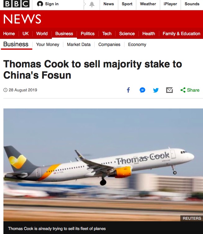 2019年8月28日,复星国际旗下复星旅游文化表示将收购英国最大旅行社托马斯·库克集团Thomas Cook。