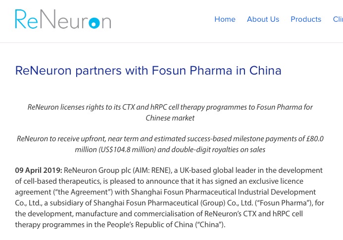 今年4月,复兴医药又斥资8,000万英镑,出手拿下ReNeuron公司旗下的两款干细胞产品CTX和hRPC。