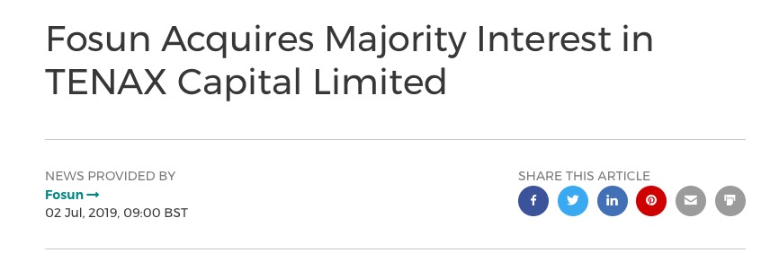 今年7月,复星国际又表示欲收购总部位于伦敦的精品资产管理公司TENAX CAPITAL Limited的大部分股权。TENAX 成立于2004年,是一家受监管的另类资产投资管理公司(“AIFM”),拥有超过15年的泛欧洲投资经验,专注于金融机构股权投资、中小企业私募债和保险挂钩证券等主动管理投资策略。TENAX 现时管理约10亿欧元资产,主要为欧洲机构投资者提供服务。TENAX 已成功创造了很多针对保险公司、银行以及其他客户的创新性的投资解决方案。此交易有待监管部门批准,预计将于2019年下半年完成。