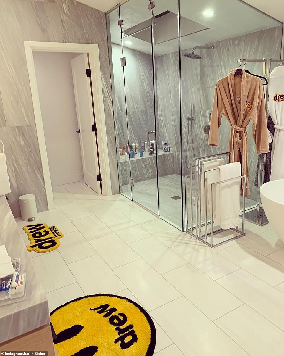 卫生间采用大理石墙面,还有Drew House的情侣浴袍。