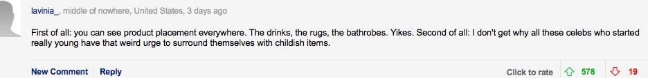 “首先,植入式广告随处可见。饮料,毯子,浴袍。其次:我不明白为什么所有这些年少成名的人都有一种奇怪的冲动,想要用幼稚的东西把自己包围起来。”