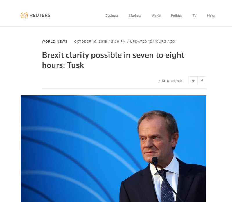 据REUTERS报道,欧盟理事会主席唐纳德·图斯克(Donald Tusk)在采访中表示:“7-8小时后应该就会知道英国什么时候脱欧了,从理论上讲,周四可能会达成协议。”
