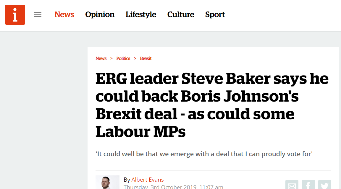 据报道,英国前脱欧大臣、ERG主席史蒂夫·贝克(Steve Baker)在采访中表示:“我很乐观,目前有可能达成一个我能够容忍的,也会投票支持的协议。”