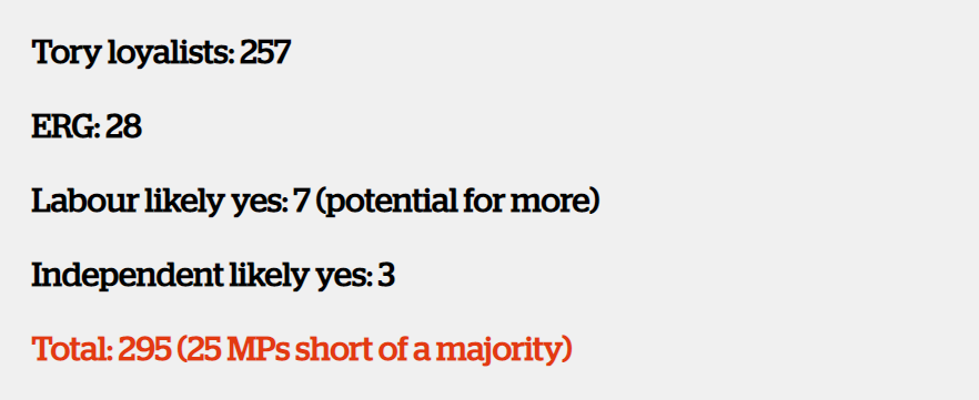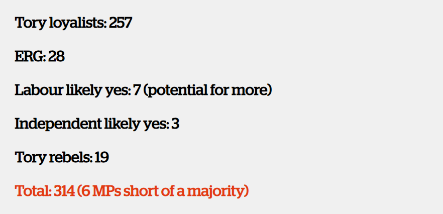 在这些人中,约有257人曾投票支持特蕾莎·梅(Theresa May)的协议,预计现在会投票支持新协议。但不到投票的最终关头,谁也不能确保万无一失。