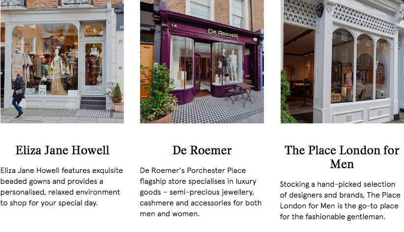 Cartier, Tiffany & Co, Harrods, Jimmy Choo, Yves Saint Laurent, Valentino, Bvlgari, Gianni Versace and Graff前来开店,此区是伦敦最时尚精华的购物名街。