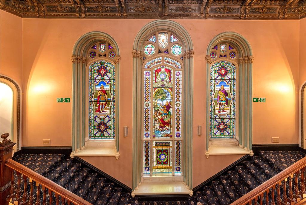 Dalmoak Castle最引人瞩目的大概就是它内部的拱形彩色玻璃窗了,似乎描绘的是欧洲古典神话凯尔特神话中的场景。这些玻璃窗是由格拉斯哥曾经最著名的两个玻璃工匠威廉和詹姆斯·基尔制作的,他们的作品甚至在格拉斯哥大教堂出现过。