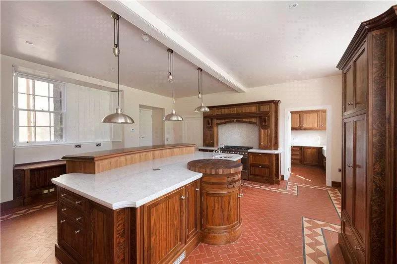 厨房也十分大气美观,拥有的胡桃木橱柜,以及碗碟、食品储藏室。