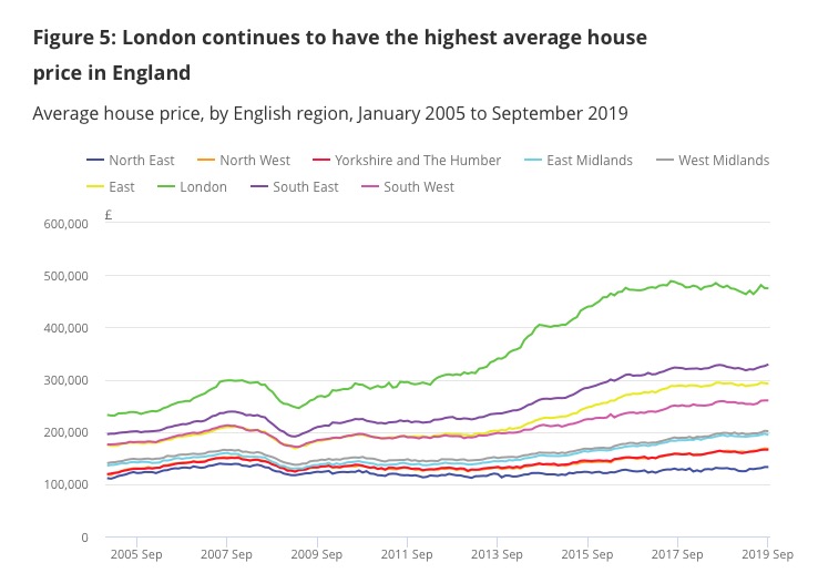 国家统计局数据显示 ,2005年1月到2019年9月,伦敦的房价涨幅最大(绿线)!