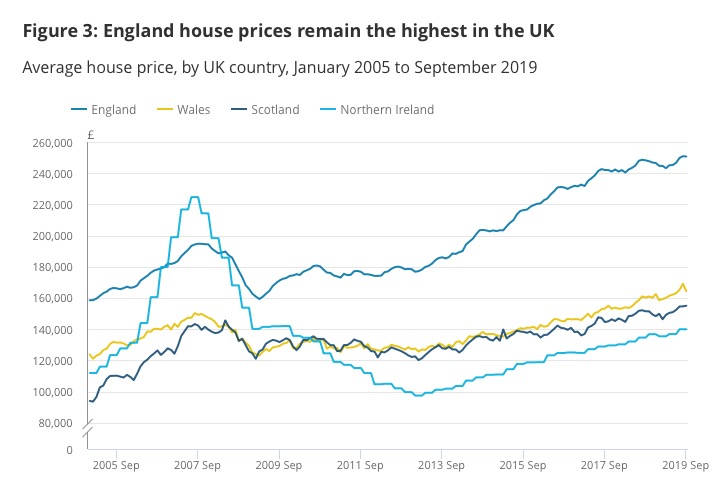 英格兰地区的平均房价从2005年1月的158,572上涨到了2019年9月的250,677,年涨幅约为4%,是威尔士地区的两倍。